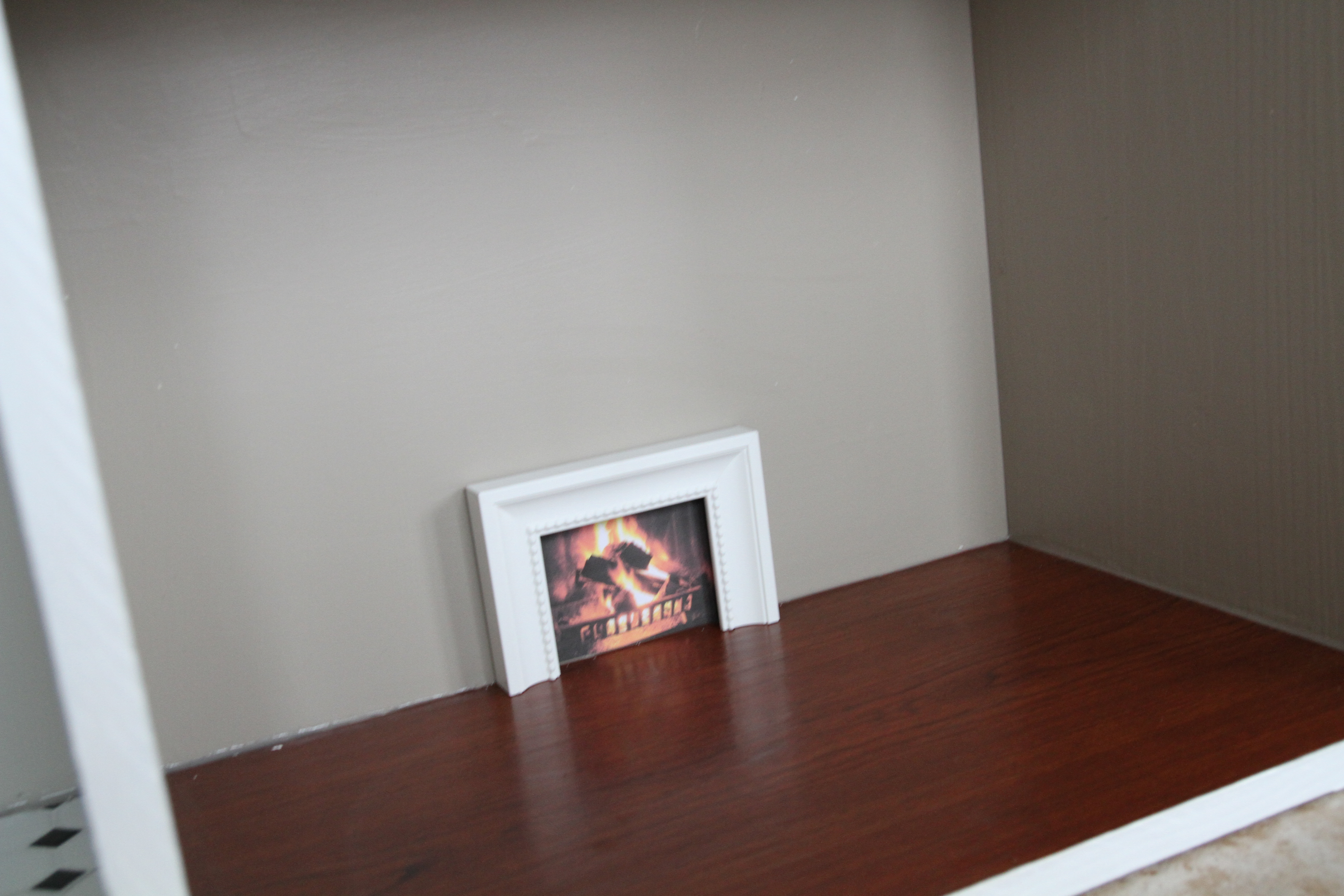 9. Take a wooden picture frame (Ikea $3) and cut to desired height of a fireplace. Tape a picture of a burning fire in behind the fireplace and secure to wall using glue or double-sided tape.