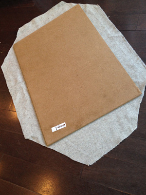 I removed the mirror from the frame and cut my old corkboard to the correct width of the mirror frame. I did not want my pinboard to show the cork so I used a piece of great tweed wool fabric and stretched it over the backing of the corkboard. I actually used mini screws to secure the fabric on the back in multiple places as it needs to be very snug. A staple gun would be easier of course 😉 You could try hot glue too I guess but I am not sure if you can really get a good tight stretch like that.