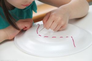 I learned to sew as a child and started with sewing by hand. While it’s definitely a fine motor skill that requires a good amount of dexterity, even small children can learn to use a larger needle safely. Not only is it great for learning fine attention to detail, but it also helps to build hand-eye coordination. Think of it as the next step past lacing cards. Even if you or your child would like to use a machine, knowing the basics of hand sewing is important; most projects at some point may need some hand sewing and it’s a good way to get comfortable with threading a needle. After that, if you have access to a machine, or even a child-size one, there is so much you can learn together.