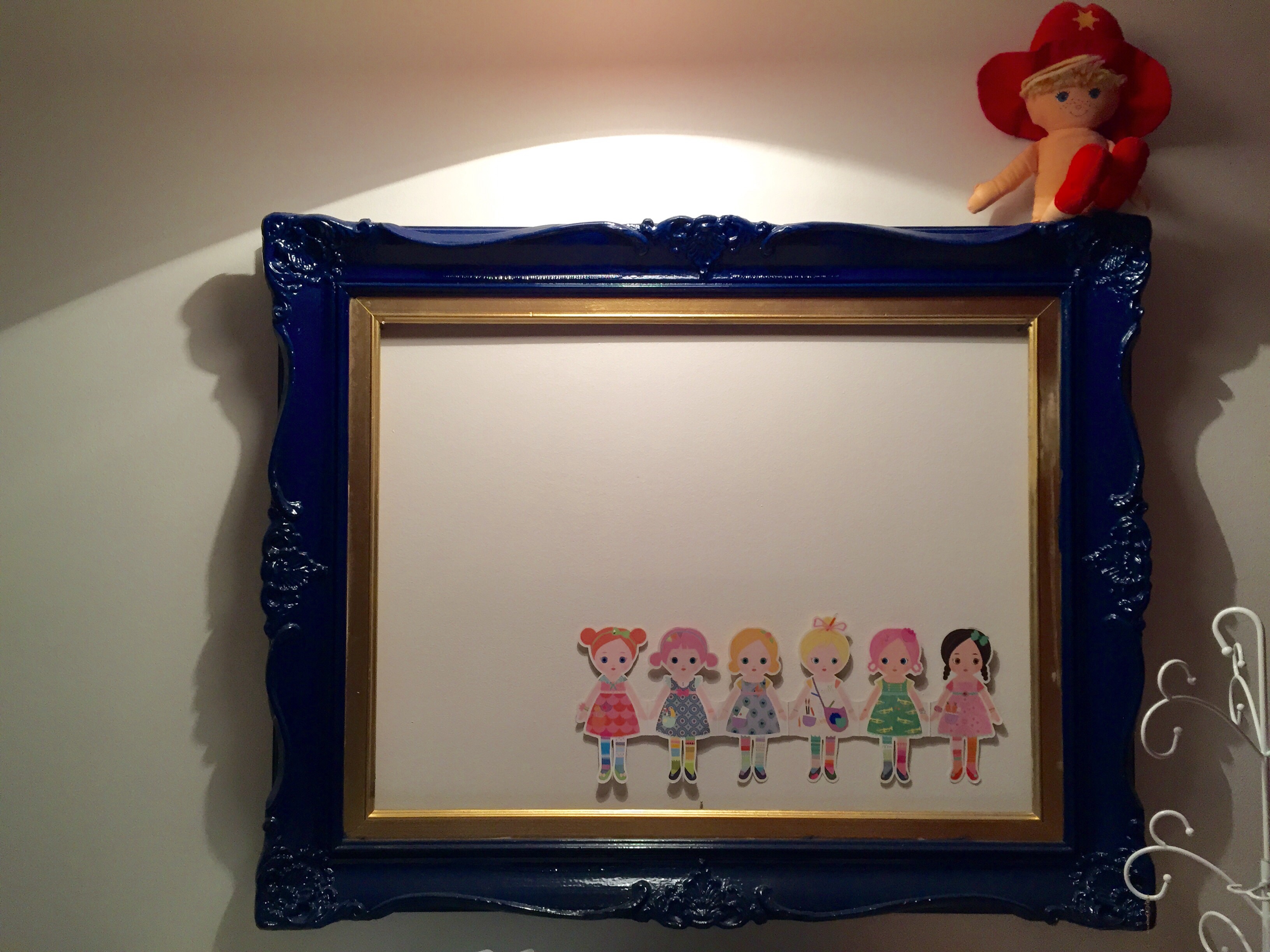 Once the piece is dry, it’s ready to hang! I deliberately wanted an empty frame to hang on the wall — I liked the idea of seeing the wall behind and sticking up pieces of my daughter’s artwork or family photos within the frame space. To hang it on the wall, I removed the ancient wire from the frame and added two picture framing hooks – one on either side. Because my frame was large, I chose two hooks to help evenly balance it on the wall.
