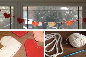 I attached the hearts and pompoms to a string I crocheted from a thick natural cotton.
