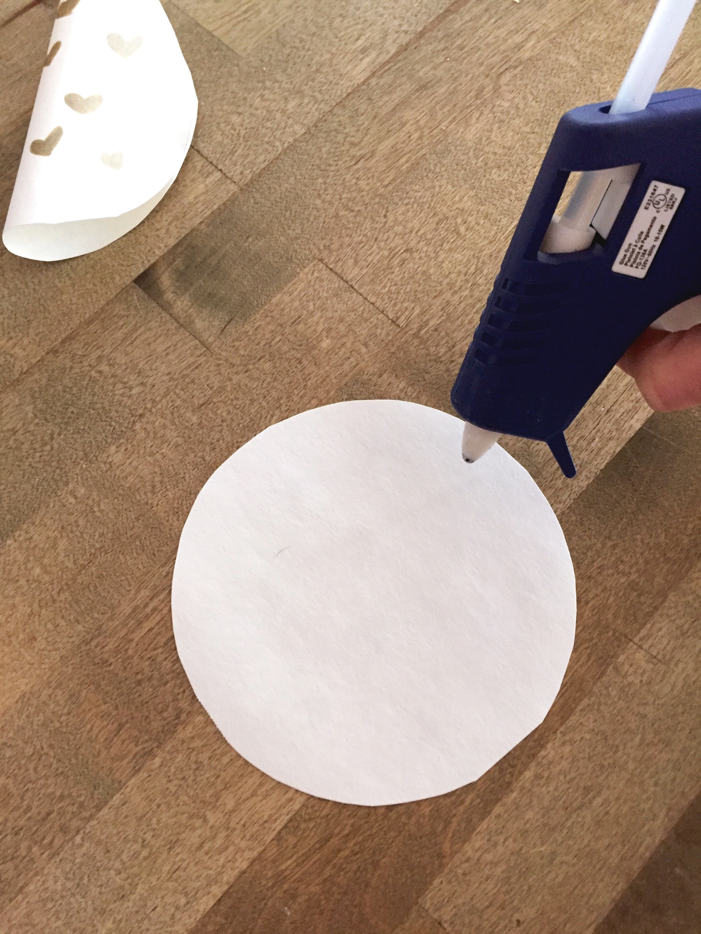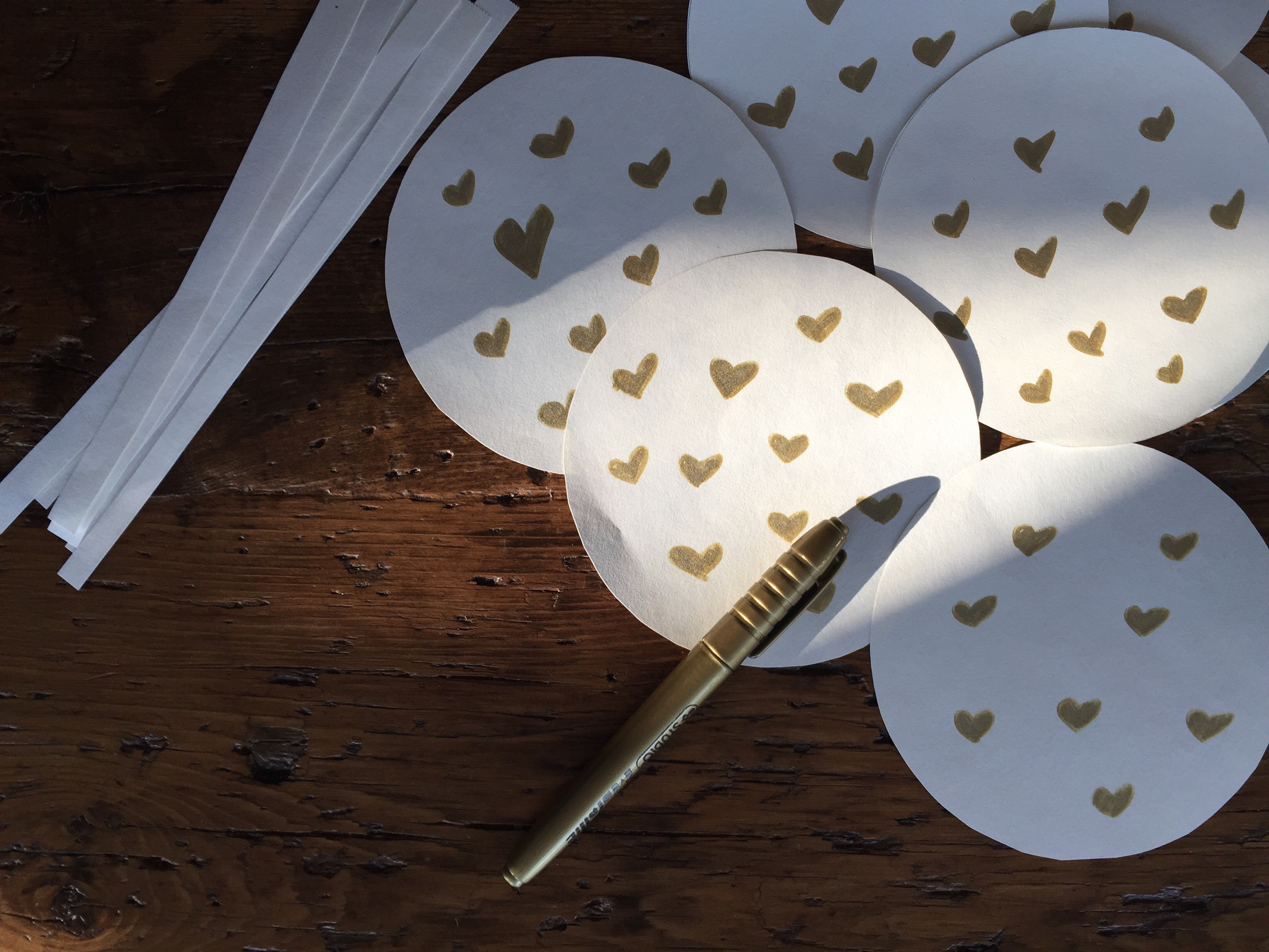 Start by tracing circles with your pencil and bowl on paper. Cut out the circles. If you’re using coloured paper (pink or red work well for this) you don’t need to decorate. I decided to use white paper and decorate my circles with small gold hearts that I coloured in myself.