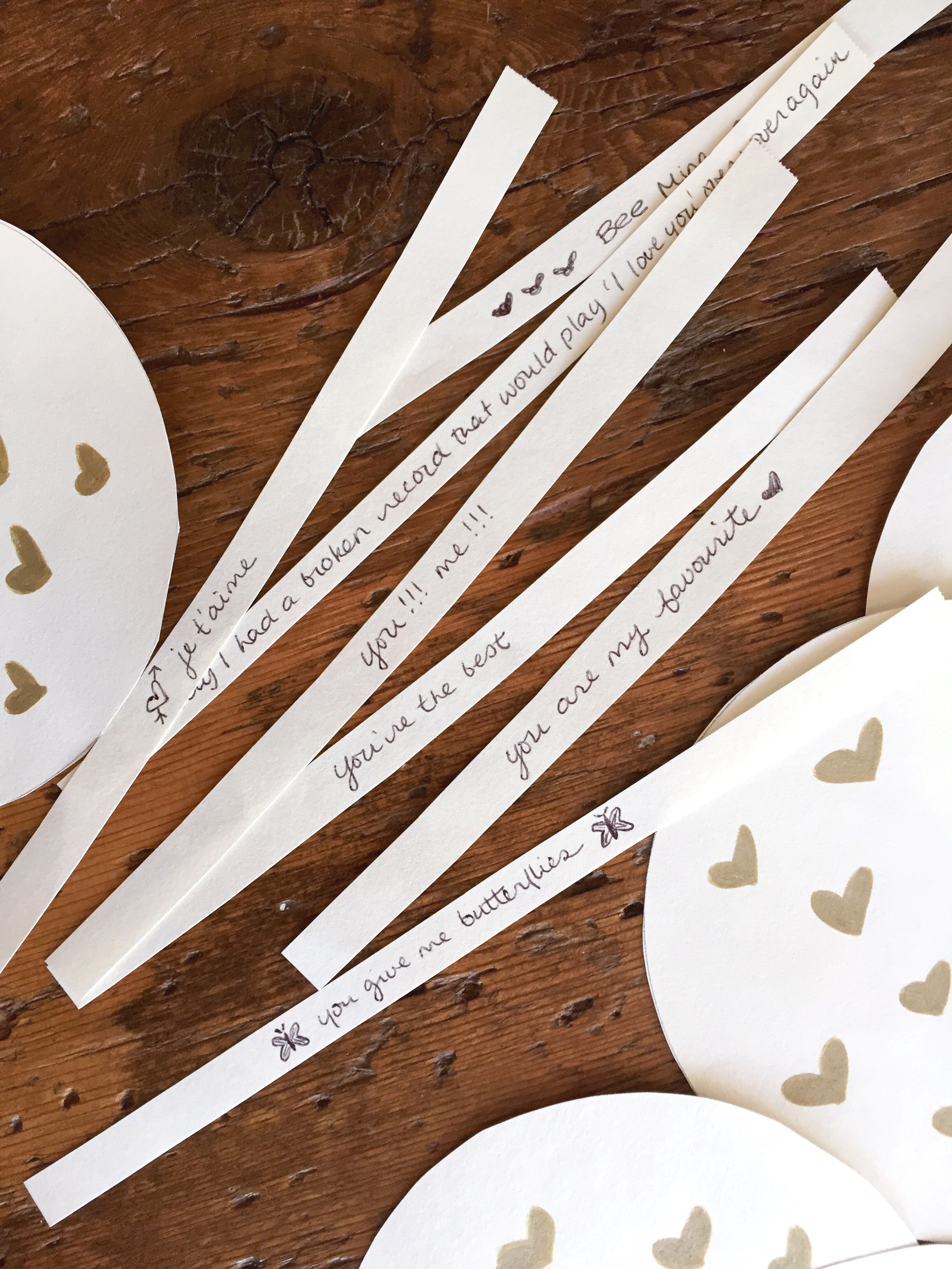 Next, cut some long, thick strips of the same paper (or white paper if you used coloured paper), about 1/3 inch wide and 6-8 inches long. Write your heartfelt messages on these strips of paper and put aside.