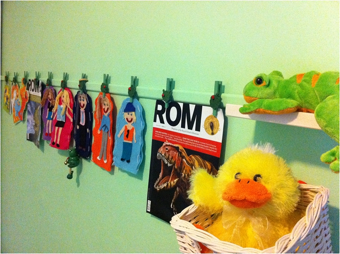 So, I created the Rail of Fame; essentially a strip of wall trimming with wooden clothes pegs, allowing you and your kid to switch it up in a matter of seconds. It is really simple but it is pretty sleek. You can make it jump from the wall by using contracting paint, or in my case I actually used left-over wall paint from his room to make the rail a more understated part of his room. To add a bit of fun, I added little lady-bugs to the clothespegs which I found for close to nothing at the dollar store. They have them in all colours and shapes, from animals to flowers, so use it to customize to your kid’s taste.