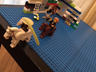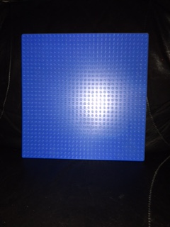 Step Three: Right the table, and prepare the flat Lego pieces. We used four, but obviously it will depend on the size of your table. A tip: when you place these on permanently, use a few Lego pieces to line the flat pieces up properly. Use the gel Krazy glue on the back of the flat pieces to permanently attach them to the table.