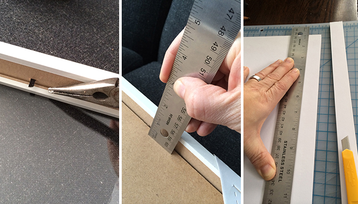 To Start: Remove the matboard and backing board from the frame (you can leave the glass) and, using your needle-nose pliers, pull out all of the metal tabs from the frame edge.