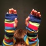 Digging through my mound of sewing material and clothing the other day, I found some baby pjs that, I guess, I had planned to mend when my kids were tiny. Oops! Stuff gets away from you when you’re elbow deep in diapers. My daughter’s too big for these footie pajamas, but she does love to be stylin’, so I made her some cool fingerless gloves from the onesie sleeves.